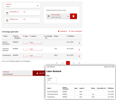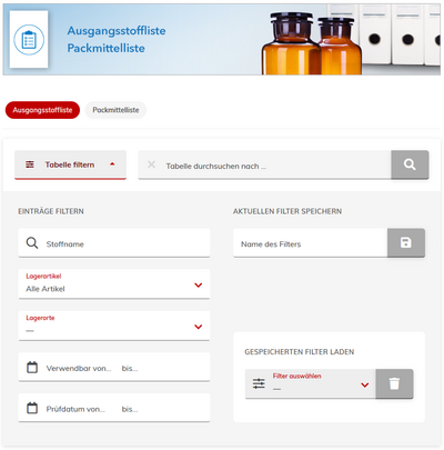 Über die praktischen Filtermöglichkeiten lassen sich individuelle Listen erstellen. So können Sie z.B. nach dem Verfallsdatum filtern um verfallene Stoffe leichter aussortieren zu können. Erstellte Filter können bei Bedarf gespeichert und wieder aufgerufen werden.
