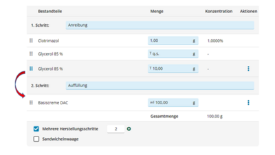 Für eine genauere Verfahrensanweisung und bessere Übersichtlichkeit kann eine Rezeptur ab sofort in beliebig viele Schritte unterteilt werden. Die Herstellungsabschnitte werden durch Verschieben der Bestandteile an die passende Stelle platziert und individuell benannt.
