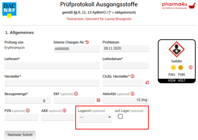 Ab sofort finden Sie auch in den Herstellungsanweisungen alle relevanten Gefahrstoffhinweise zu den verwendeten Ausgangsstoffen. Die nötigen Maßnahmen zum Arbeitsschutz sind vorausgefüllt und können optional noch ergänzt werden.