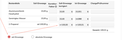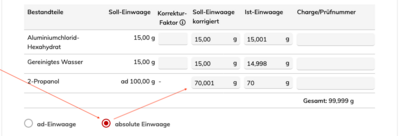Im neuen Einwaage-Modus absolute Einwaage wird die Soll-Einwaage des ad-Bestandteils nach jeder Einwaage laufend neu berechnet.
