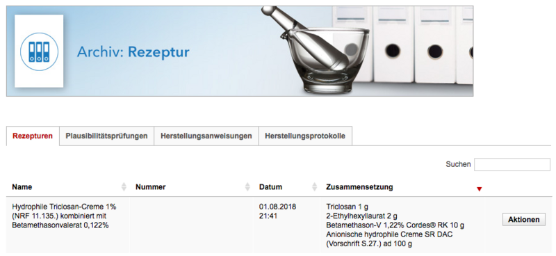 Unsere Archiv-Struktur wurde angepasst. Neben den einzelnen Dokumentenarchiven (z.B. für Plausibilitätsprüfungen, Herstellungsanweisungen) finden Sie nun in diesem Bereich auch übergeordnete Archive für die Rezepturen und Defekturen.