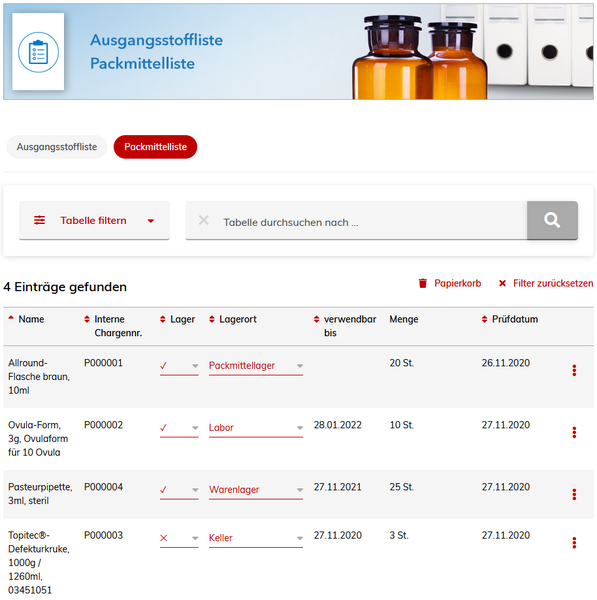 Sie haben auch die Möglichkeit Ihre Listen "aufzuräumen" und so können Sie z.B. bereits verbrauchte oder entsorgte Ausgangsstoffe und Packmittel in den Papierkorb verschieben. Über den Punkt Papierkorb können sie wiederum auch diesen verwalten und z.B. gelöschte Artikel wiederherstellen.