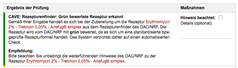 Zusätzlich erkennt das System, wenn Sie eine Rezeptur frei eingegeben haben, die mit einer vergleichbaren Zusammensetzung im Rezepturenfinder des DAC/NRF hinterlegt ist. Sie erhalten im Protokoll der Plausibilitätsprüfung einen Hinweis mit direktem Link zur DAC/NRF-Seite. Damit gelangen Sie schnell zu weiteren wertvollen Informationen.