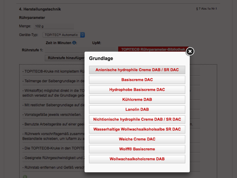 Jetzt können Sie auch für den TOPITEC® AUTOMATIC aus einer Rührparameterbibliothek die empfohlenen Systemparameter für ausgewählte Grundlagen übernehmen.