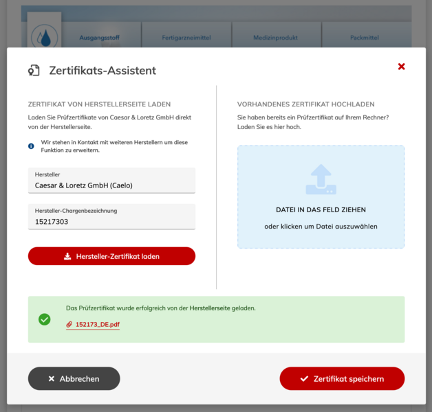 Über den neuen Zertifikats-Assistenten können Prüfzertifikate direkt vom Hersteller geladen werden. Herstellername und Chargenbezeichnung werden automatisch aus dem Prüfprotokoll übernommen, so dass ein Knopfdruck ausreicht um das Zertifikat in das Protokoll einzubinden.