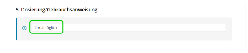 Die in der Eingabemaske angegebene Dosierung wird nun automatisiert in das Herstellungsprotokoll und das Etikett übernommen. Sie finden die Angaben zur Dosierung im Herstellungsprotokoll im neuen Abschnitt „5. Dosierung/Gebrauchsanweisung“.