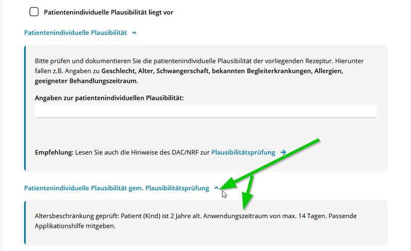 Vermerken Sie bei einer neuen Rezeptur direkt im Plausi-Ergebnis die relevanten Patientenangaben in Bezug auf die Rezeptur. Hierunter fallen z.B. Anwendungsbeschränkungen bei Kindern oder relevante Begleiterkrankungen. Setzen Sie danach das Häkchen bei „geprüft“.