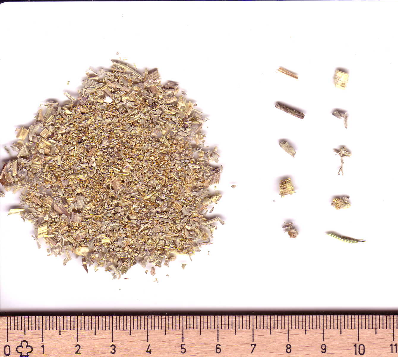 Allgemein: Getrocknete Zweige der blühenden Pflanze mit bis zu 4 mm dicken Stängelanteilen; aromatisch und zugleich bitter schmeckende Droge