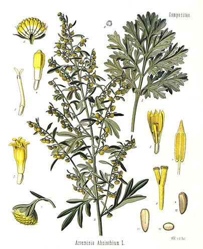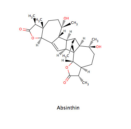 • Blätter enthalten ca. 0,3%, die Blüten etwa 0,15% Bitterstoffe; Hauptverbindungen sind die Sesquiterpenlactone Absinthin (BW: 12 700 000) und das isomere Anabsinthin (bildet sich im Sauren durch eine Ringschlussreaktion aus Absinthin)