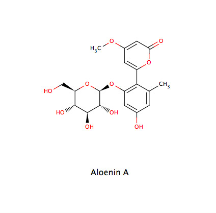 • 12-25% Hydroxyanthracenderivate (nach AB mindestens 18%): Aloin (Barbaloin = Gemisch der beiden Diastereomere Aloin A und B), Aloeemodin, Chrysophanol, 5-Hydroxyaloin (7-Hydroxyaloin fehlt dagegen)