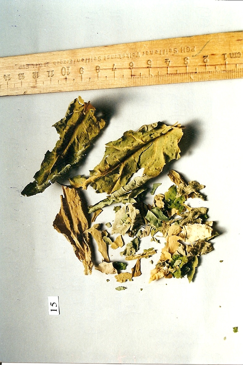 Allgemein: Getrocknete Blätter, manchmal mit blühenden und gelegentlich Früchte tragenden Zweigspitzen der getrockneten Pflanze; stark braun verfärbte Blätter sind ein Hinweis auf die Verschiebung der Mengenverhältnisse Hyoscyamin: Atropin zugunsten des Racemates; CAVE: alkaloidhaltig sind alle Pflanzenteile!