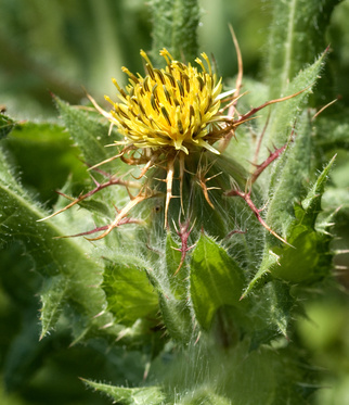 - Gelbe, von bestachelten Hüllblättern umgebene Blütenköpfe