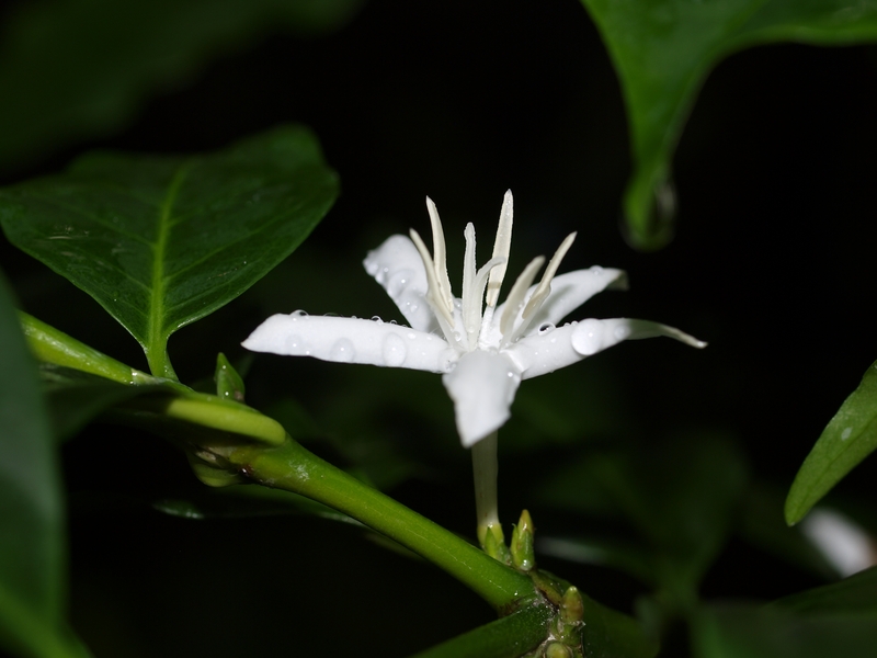 • Aus den weißen Blüten bilden sich die Kaffeekirschen, in reifem Zustand meist rot gefärbte Steinfrüchte