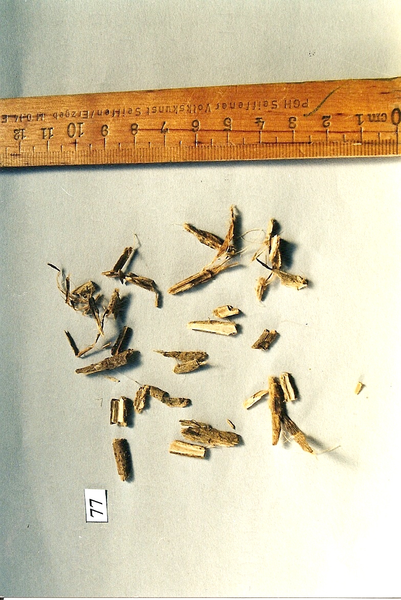 Mikroskopie: Steinzellen mit stark verdickter, etwas gelblicher Wand (einzeln oder in Nestern), Bruchstücke unverholzter (!) Fasern und zahlreiche bis 45 µm große Calciumoxalatdrusen