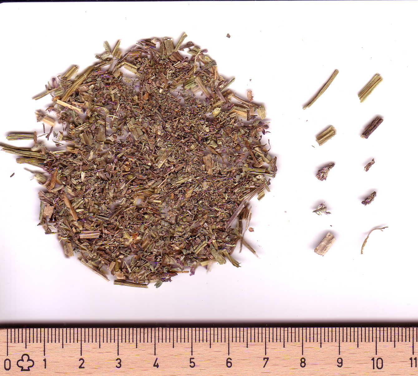 Allgemein: Fragmente der doppelt fiederspaltigen Blätter sowie hohle, kantige Stängelanteile. Außerdem: schrumpelige, violette Blüten mit bräunlichem Fleck an der Spitze sowie kuglige Schließfrüchte von braungrüner Farbe mit jeweils einem Samen.