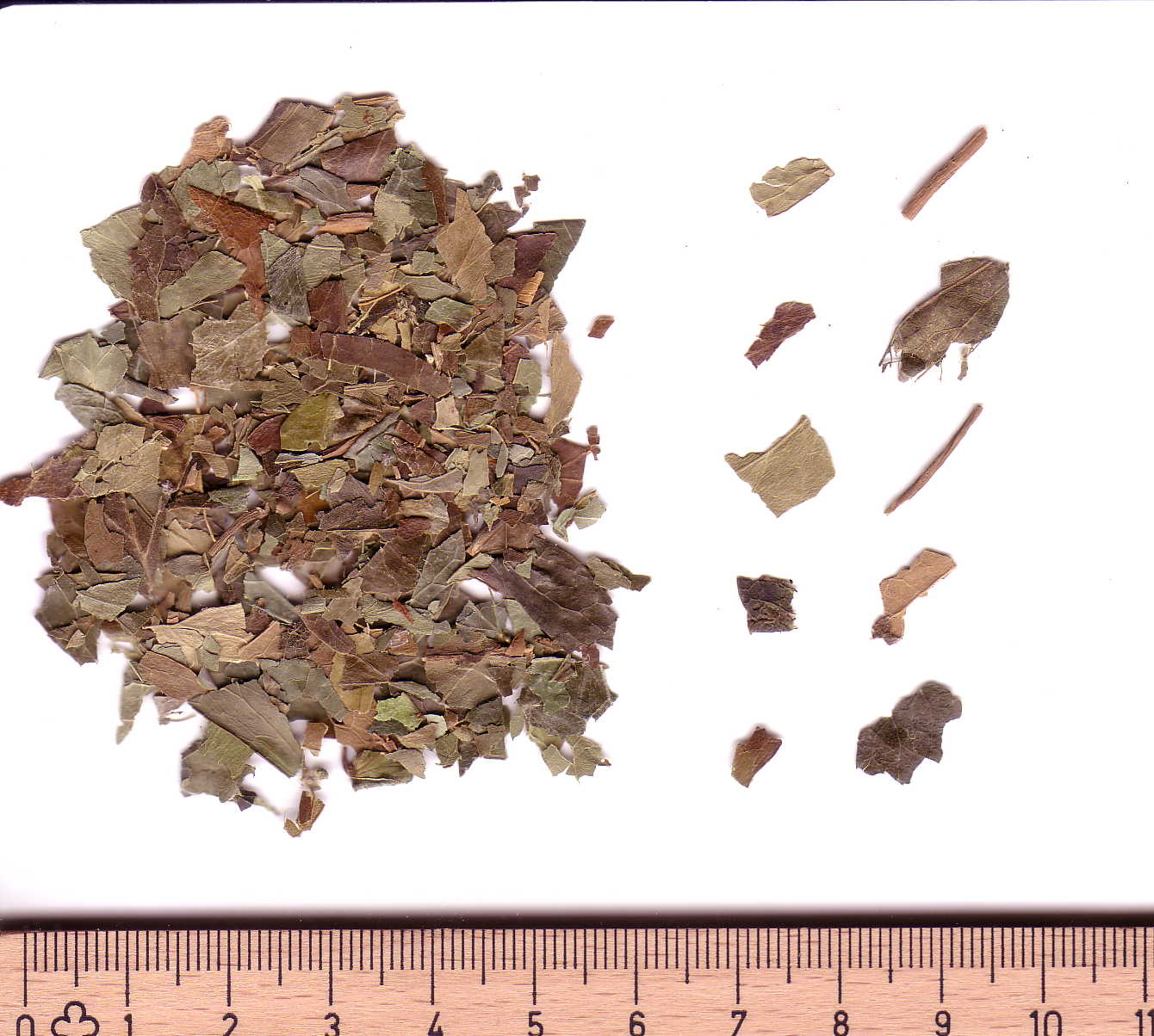 Allgemein: Im Frühling gesammelte Blätter von nicht blühenden Sprossen des unteren Teils der Pflanze; ledrige Beschaffenheit der frischen Blätter, helle Nervatur; längsgefurchter, dunkelbrauner Stiel