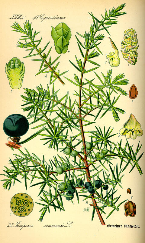 • Ebenfalls offizinell: Juniperi lignum (= Wacholderholz)
