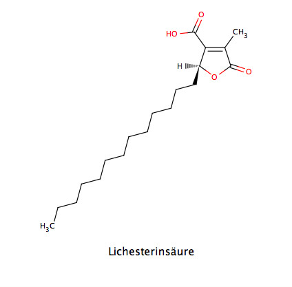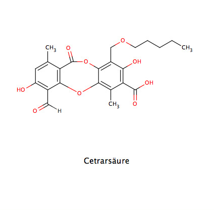 Isolichenin: ca. 40 Glucoseeinheiten, 1,3- und 1,4-glykosidisch verknüpft; Stärke-ähnlicher Aufbau; löst sich bereits in kaltem Wasser; mit Jod Blaufärbung - Bitter schmeckende Flechtensäuren ("Depsinone"), z. B. Lichesterinsäure und Cetrarsäure