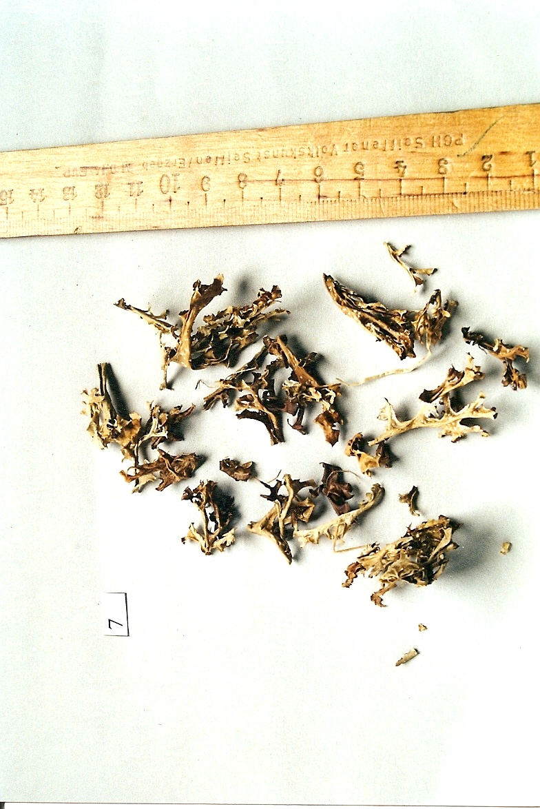 Allgemein: Unregelmäßige, mitunter eingerollte Stücke der an der Sonne getrockneten und gebleichten, grünlich-braunen bis weißlich-gelben Thalli der Flechte; beiderseits ausgeprägt glatte Oberfläche. In getrocknetem Zustand sehr brüchige Konsistenz; nach Quellung in Wasser gummiartig