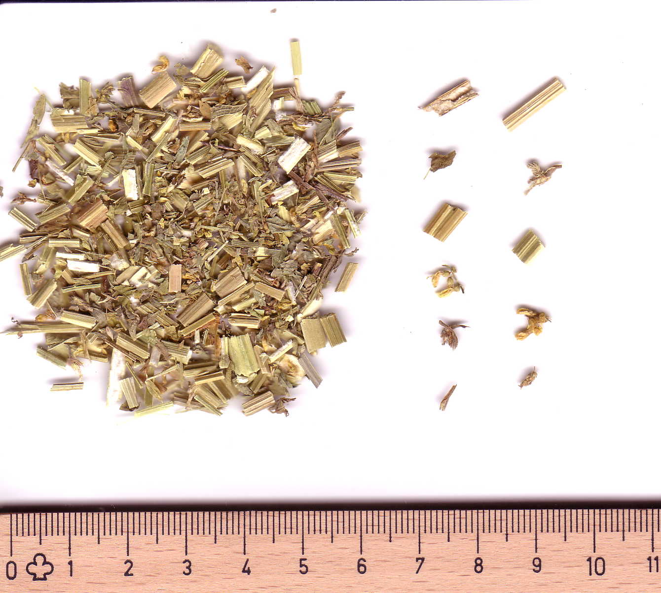 Allgemein: Die Schnittdroge besteht aus kahlen, allenfalls leicht behaarten Blattfragmenten sowie hohlen, längsgefurchten Stängelstückchen; hellgelbe Schmetterlingsblüten, angeordnet in Trauben. Schmutzig-gelbe bis braune Hülsenfrüchte, meist unbehaart und geschlossen bleibend.