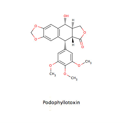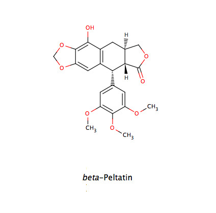 - Das instabile Podophyllotoxin wird durch chemische Partialsynthese in die zytostatisch wirksamen Substanzen Teniposid und Etoposid überführt