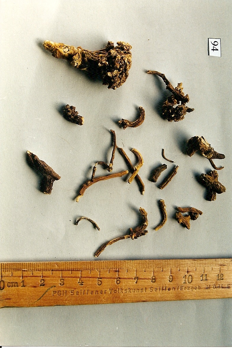 Allgemein: Gewundene, gelb- bis dunkelbraune Wurzel von eher filigraner Gestalt mit ausgefranstem Wurzelkopf; im Querschnitt wird die weißliche Rinde sowie der gelbe Holzkörper sichtbar; eigenartiger Geruch