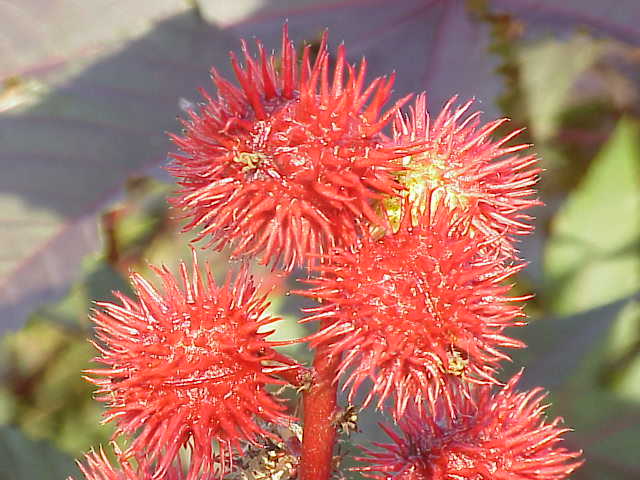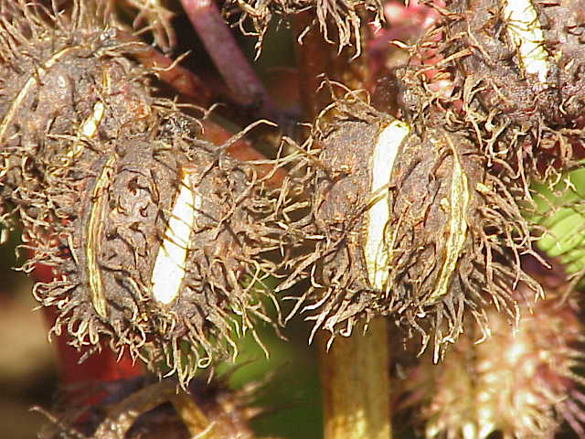 - Es werden rotbraune, mit weichen Stacheln besetzte, dreifächerige Kapselfrüchte mit rötlichbraun-marmorierten, bohnenförmigen Samen gebildet