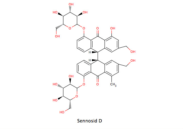 - Hydroxyanthranoidderivate (3,4% bei Alexandriner-Sennesfrüchten; 2,2% bei Tinnevelly-Sennesfrüchten), Hauptbestandteil sind Dianthronglykoside → Sennoside A, B, C und D