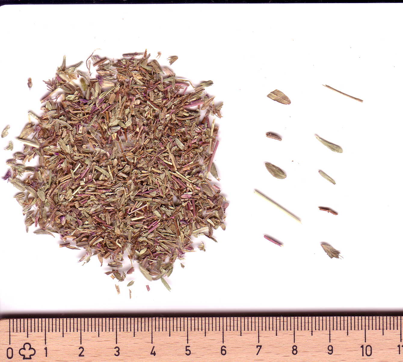 Allgemein: Im nicht zerkleinerten Zustand bis max. 1 cm lange, drüsig punktierte Blätter mit glattem Rand; hohle, leicht kantige und schwachbehaarte Zweigbruchstücke; Blütenfragmente von bräunlich-rosane bis rötlich-violetter Farbe