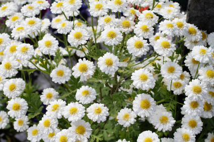 Pflanze: Tanacetum parthenium (syn.: Chrysanthemum parthenium) / Mutterkraut (Syn. Falsche Kamille, Zierkamille, Fieberkraut)